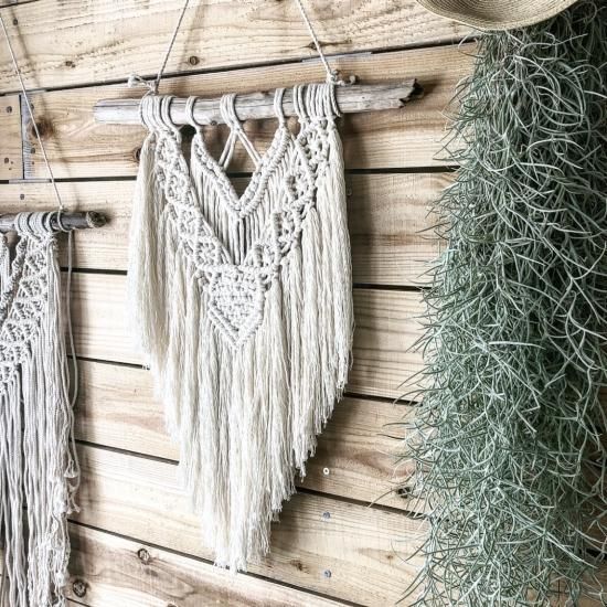 マクラメ編みのタペストリー。流木を軸に、コットン100%のロープで編んでいます。