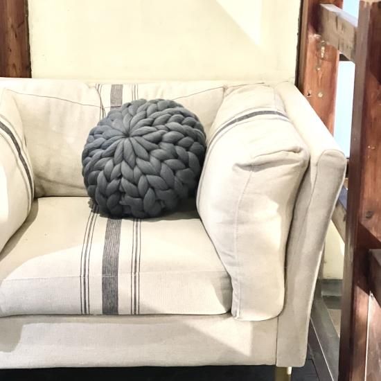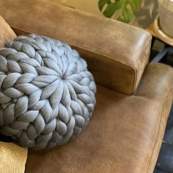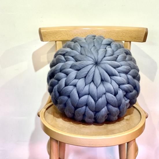高品質なメリノウール(羊毛)の極太毛糸で編んだクッション。低刺激でとても温かく、分厚いニットはふわふわとした弾力性があります。ソファやベッドでクッションとしてはもちろん、インテリアのひとつに。
