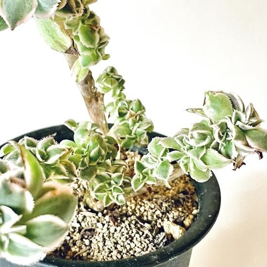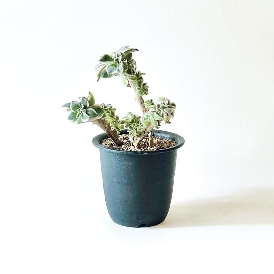 サンバーストは葉の外側に斑が入り、ピンク色で縁取られていてとても華やかで魅力的な姿をしていますが、石化しているこちらの個体は、これでもかというほど強い個性を放ったシルエットをしています。